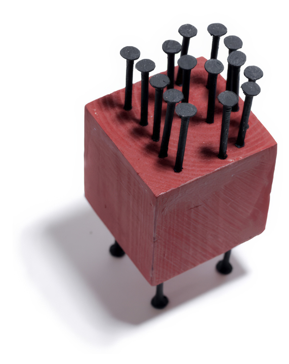 Wood 5x5x5 cm, nails, acrylic (2019). How to read numbers: the number is read from above.